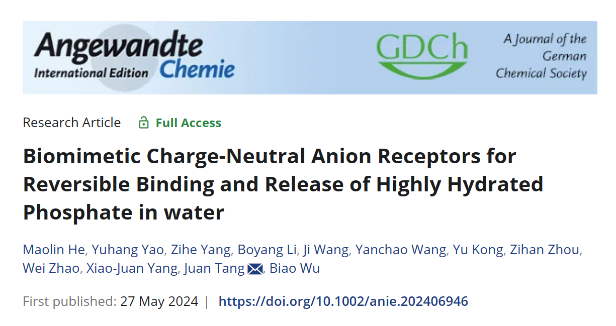 近日,亚洲无码 吴彪教授和唐娟特别研究员团队在仿生电中性阴离子受体与水中高水合磷酸盐的可逆结合和释放方面取得重要进展。相关成果以“Biomimetic Charge-Neutral Anion Receptors for Reversible Binding and Release of Highly Hydrated Phosphate in water”为题发表于国际顶级期刊《Angewandte Chemie International Edition》。亚洲无码 为唯一通讯单位,吴彪教授和唐娟特别研究员为论文通讯作者,化学与化工亚洲无码 硕士生何茂琳为第一作者。此项研究得到了国家自然科学基金,亚洲无码 青年教师学术启动计划的资助及亚洲无码 分析测试中心的支持,同时福州大学姚宇航老师在理论计算方面给予了大力支持。