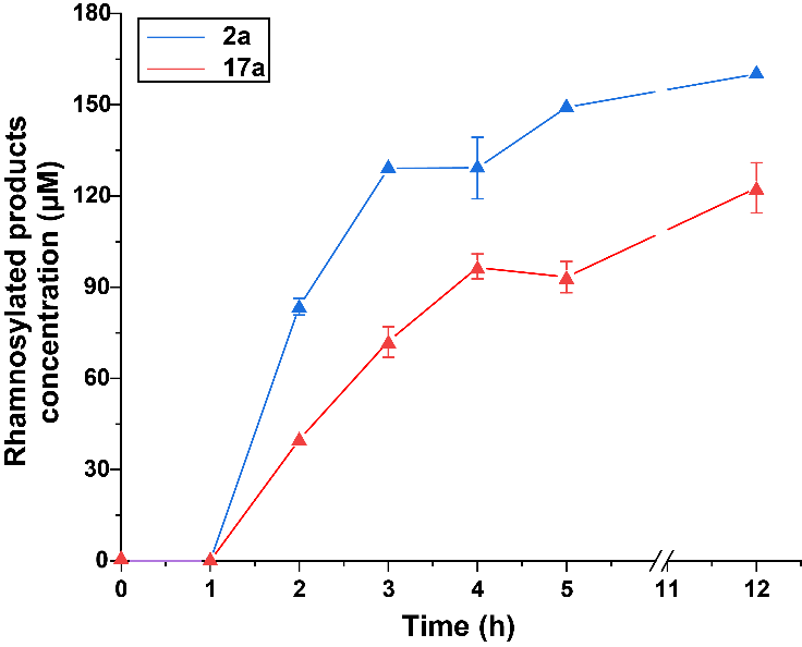 针对糖基供体UDP-Rha成本高的问题,构建了包括蔗糖合酶GuSUS1-Δ9、UDP-Rha 合酶AtRHM2和双功能鼠李糖合酶AtNRS/ER的三酶级联体系,实现了以廉价的蔗糖为原料合成UDP-Rha。将该体系与UGT91H_A1偶联的四酶体系(分步法)降低了甘草次酸 3-O-GlcA-Gal-Rha(2a)和常春藤皂苷元 3-O-Ara-Rha-Rha(17a)的合成成本,底物转化率分别达到80.1 ± 0.3%和61.3 ± 4.1%。