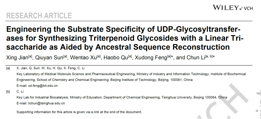 相关研究成果以“Engineering the Substrate Specificity of UDP-Glycosyltransferases for Synthesizing Triterpenoid Glycosides with a Linear Trisaccharide as Aided by Ancestral Sequence Reconstruction”为题目在国际知名期刊Angewante Chemie International Edition上发表(DOI: /10.1002/anie.202409867)。亚洲无码 博士研究生简行为该论文的第一作者,清华大学李春教授与亚洲无码 长聘副教授冯旭东为该论文的共同通讯作者。