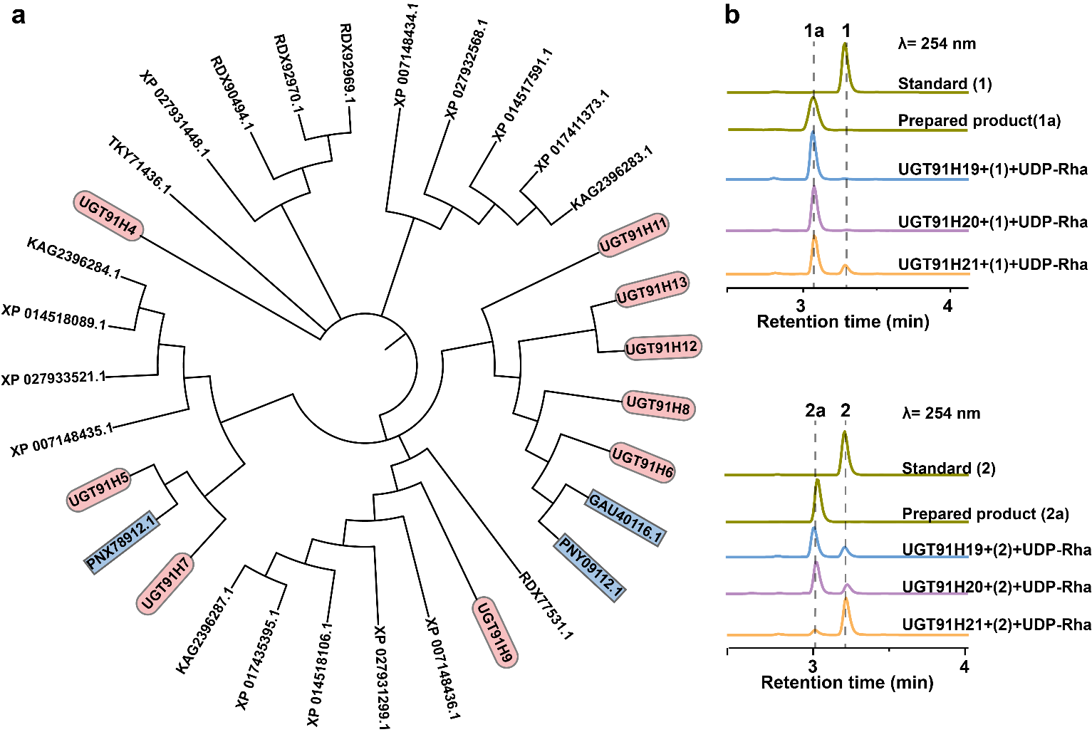 本研究首先对7个UGT91H亚家族酶进行系统性表征,结果表明7个UGTs对14个三萜化合物有催化活性,特异性的在其C2''-OH修饰一分子糖基,成功合成26个三萜直链三糖苷。揭示了7个UGT91H亚家族酶催化糖基受体底物的结构特点:仅可催化在C3-OH修饰二糖基且第一个糖基为葡萄糖醛酸基或葡萄糖基的三萜化合物,而对三萜苷元或三萜单糖苷则没有催化活性。另外,7个UGTs对UDP-糖基供体具有较为严格的特异性,对UDP-鼠李糖(UDP-Rha)具有最高的偏好性,对UDP-木糖(UDP-Xyl)次之,而对其他UDP-糖供体则没有催化活性。