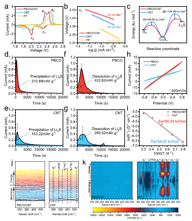 通过组装扣式电池来评估电化学性能。进行了循环伏安(CV)测试,以揭示充放电过程中硫物质的转化,PBCO展现了更低的电压迟滞和更好的电化学活性。CV衍生的Tafel斜率和相对活化能也表明PBCO更有利于多硫化物转化。此外,通过Li2S沉积和溶解实验,对称Li2S6电池,和活化能测定证明了PBCO对于多硫化物催化转化的提升机制。同时,原位拉曼光谱结果直观地揭示了电解液中多硫化物在整个过程中的实时变化,表明PBCO减轻了穿梭效应,加速了多硫化物的氧化还原转化。