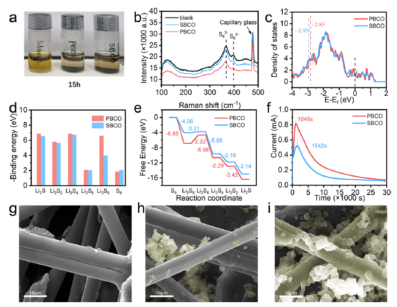 图4. PBCO与SBCO在多硫化物吸附和氧化还原转化理论计算和实验中的比较