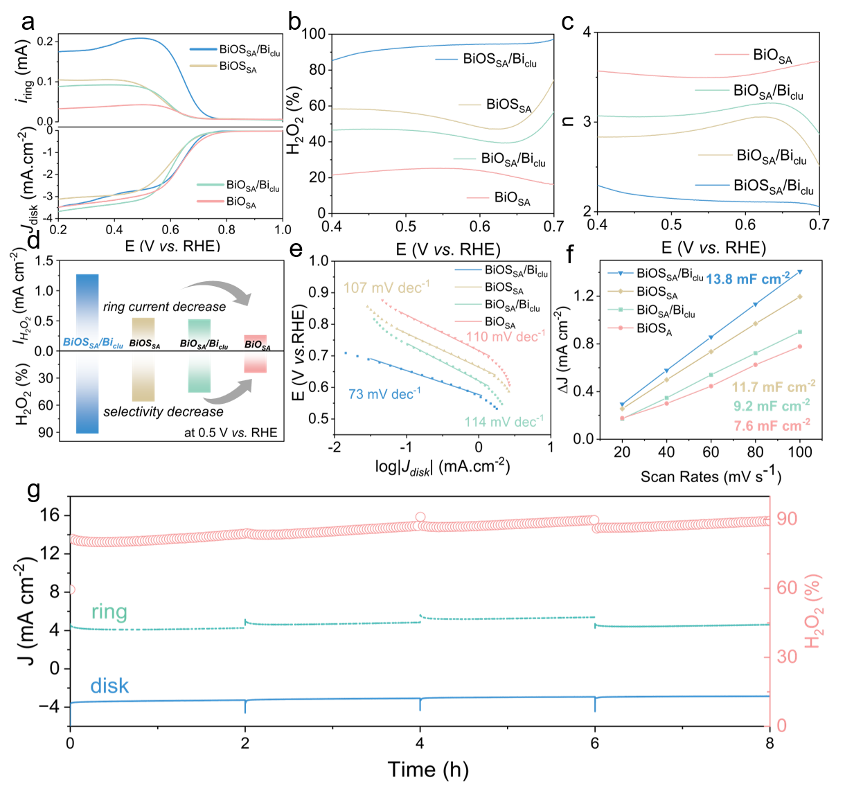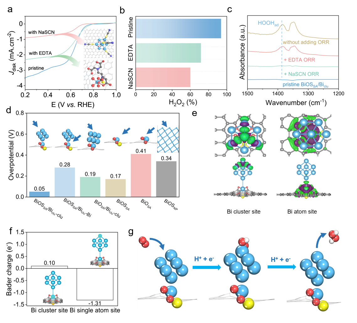 位点毒化实验和理论计算结果表明,BiOSSA/Biclu催化剂中的Bi纳米团簇具有适宜的电荷密度分布,控制了更多的活性,是主要的催化活性位点;而相邻不对称O, S配位的Bi单原子控制了更多的选择性,改变了Bi纳米团簇的电子结构,从而优化了结合能,削弱了关键中间体*OOH的化学吸附强度,导致更大的2e- ORR倾向。原子分散的Bi和Bi纳米团簇相互配合,协同催化了2e- ORR过程。
