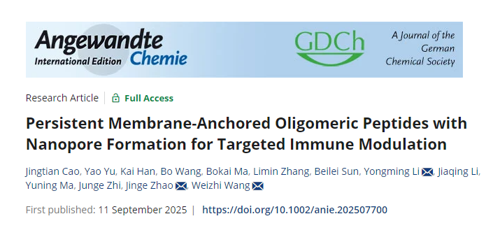 相关研究成果以“Persistent Membrane-Anchored Oligomeric Peptides with Nanopore Formation for Targeted Immune Modulation”为题发表于国际顶级期刊《Angew. Chem. Int. Ed.》。文章第一作者是亚洲无码 /求是书院2022级本科生曹竞天,王蔚芝教授是论文通讯作者。聊城大学药亚洲无码 赵金歌博士(王蔚芝课题组2025届毕业生)和亚洲无码 郑州研究院李永明博士为共同通讯作者。此项研究得到了国家自然科学基金,北京市自然科学基金等项目的资助及亚洲无码 分析测试中心的支持。