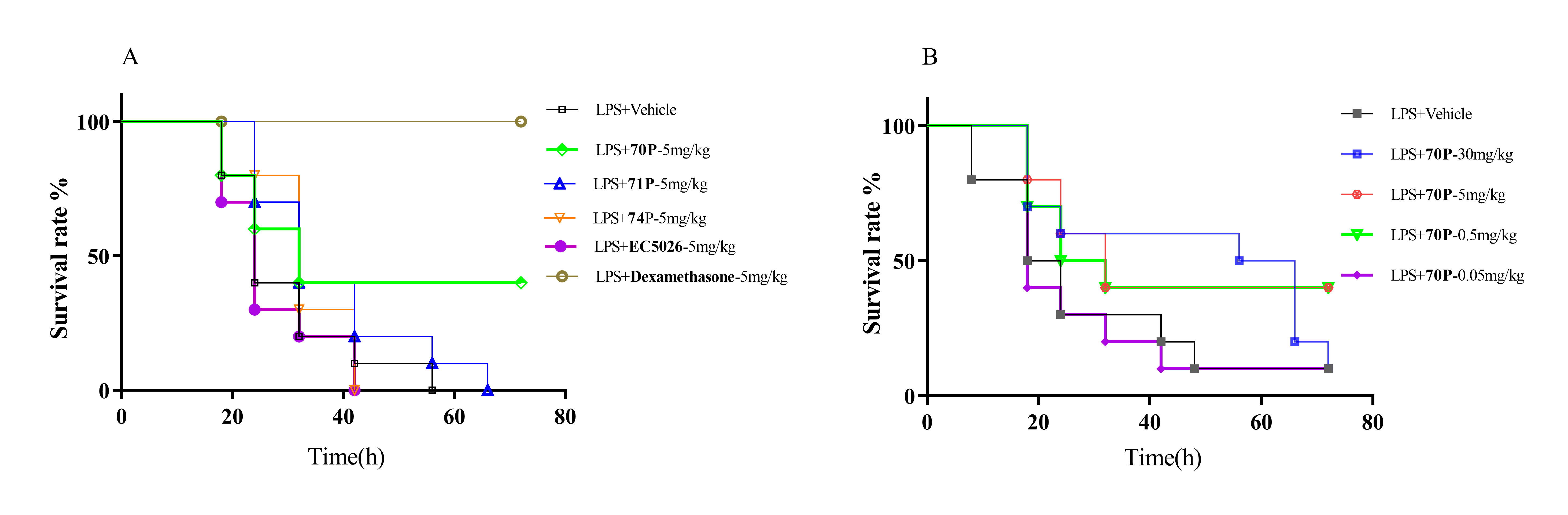 图3 70PFZQ-21)、71P74PEC-5026治疗后败血症模型小鼠的存活曲线