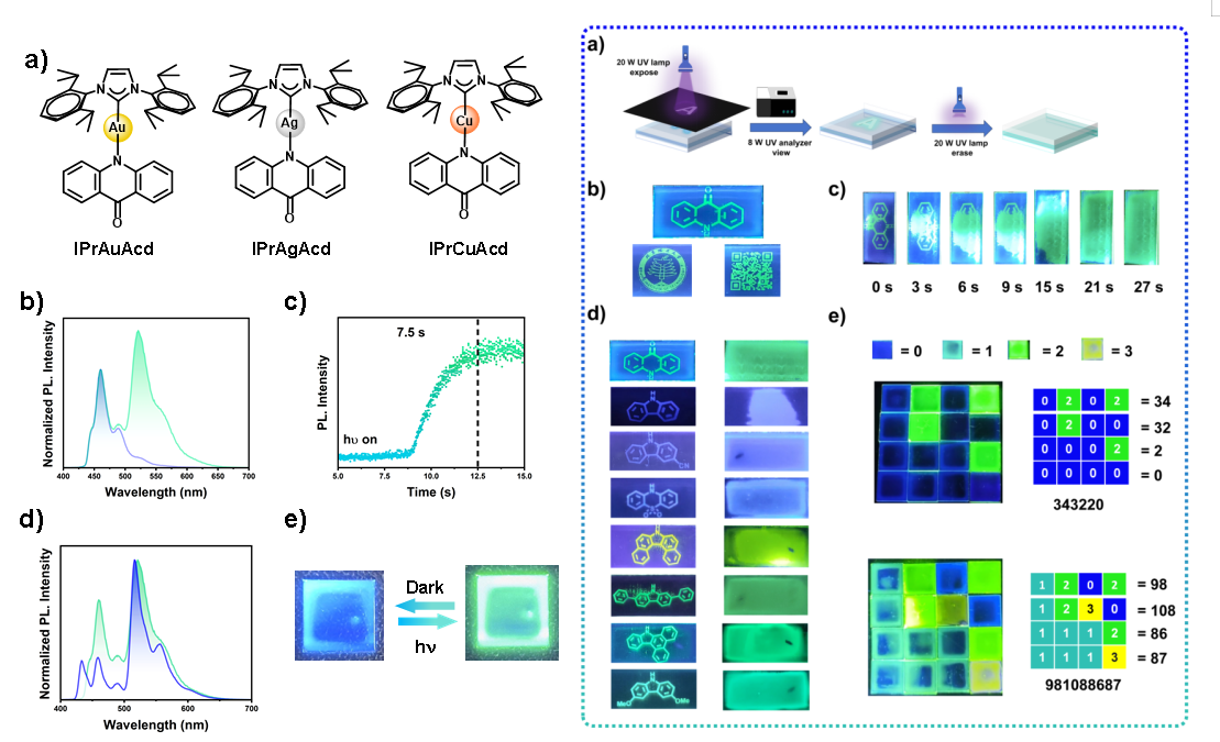 图1. (左)a). IPrMAcd(M=Au, Ag, Cu)的化学结构。b). IPrAuAcd@PMMA在光激活前(蓝色)和光激活后(绿色)的归一化发射光谱。c). IPrAuAcd@PMMA 在 517 nm处的光致发光强度随激活时间的变化。 d). IPrAuAcd@PMMA在80 K时的发射光谱(蓝色)和光激活后在室温下的发射光谱(绿色)。 e). IPrAuAcd@PMMA 样品在光激活前后的图像。
