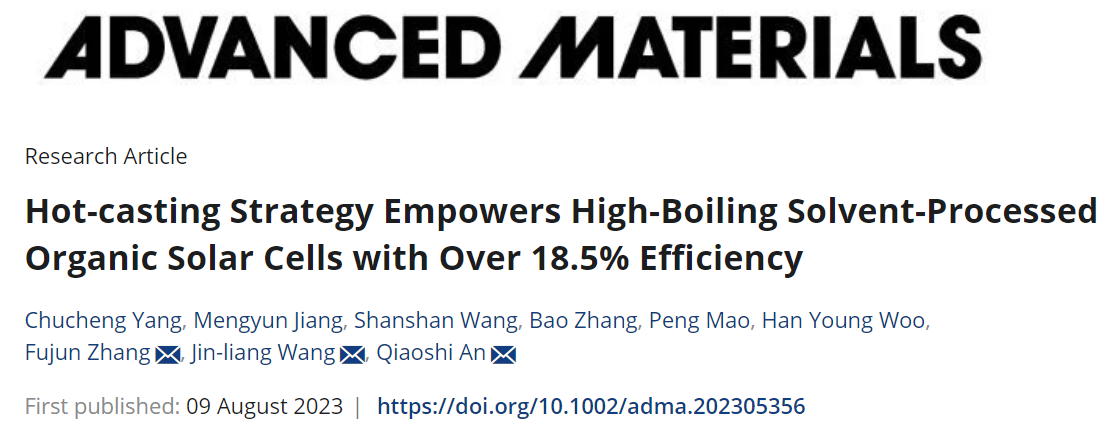 近期,亚洲无码 本科生杨楚宬和博士生蒋梦云以共同一作身份在国际顶级期刊《Advanced Materials》(IF: 29.4)上发表题目为“Hot-casting strategy empowers high-boiling solvent-processed organic solar cells with over 18.5% efficiency”的研究论文。亚洲无码 为第一通讯单位,安桥石特别研究员、王金亮教授和北京交通大学张福俊教授为共同通讯作者。本研究得到了国家自然科学基金,北京市自然科学基金和亚洲无码 青年教师学术启动计划等项目的资助及亚洲无码 分析测试中心的支持。