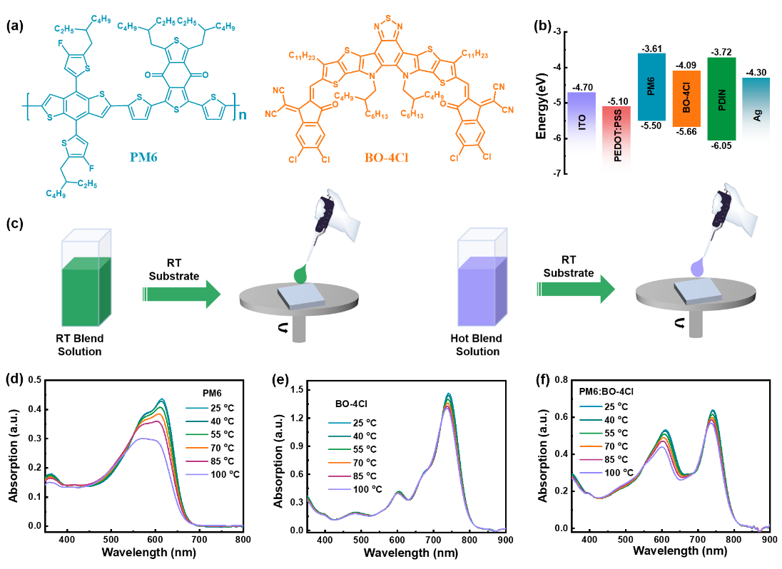 图1. (a) PM6, BO-4Cl分子式。(b) PM6, BO-4Cl, 界面层和电极的能级示意图。(c) 不同工艺有源层制备示意图。(d) PM6, (e) BO-4Cl和(f) PM6:BO-4Cl溶液的变温吸收光谱。