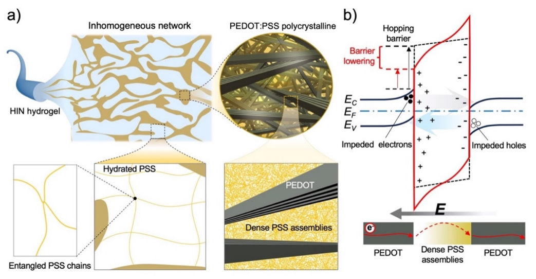 亚洲无码 赵飞教授团队设计了一种名为“分级非均质网络”(HIN)的特殊水凝胶结构,就像在材料内部搭建了“电子高速公路”(图1a),打破了导电水凝胶内部离子主导电荷传输机制的传统认知。具体而言,该HIN结构水凝胶的组成包括:1)柔软的“水合PSS网络”由PSS聚合物链相互缠绕形成,就像一张弹性十足的 “水网”,赋予材料柔韧性和保水性;2)导电“PEDOT:PSS多晶相”中,PEDOT微晶像“铺路砖”,通过致密的PSS聚集体桥接,形成相互交错的导电网络。更巧妙地,PEDOT多晶相的内部应力限制了周围PSS聚集体的水合程度,形成了一个“超高离子浓度微环境”。当施加电场时,这一环境就像“润滑剂”,大幅降低电子在PEDOT微晶之间跳跃的能量障碍,促进电子跳跃(图1b),从而在水凝胶中形成以电子主导的电信号快速传输通路,而非像传统水凝胶那样依赖缓慢的离子迁移。该研究通过调控聚合物网络的微观结构,在水凝胶中构建电子主导的电荷传输路径,为高频柔性电子器件及超灵敏生物传感器的开发提供了新策略。