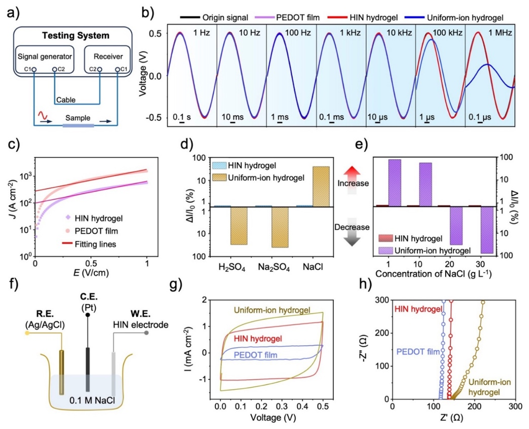 作者通过交变信号传输测试、I-V特性曲线、在离子环境中电信号传输稳定性以及电化学性能测试,进一步揭示HIN水凝胶内部存在电子主导的电荷传输通路,以及高效的界面离子-电子转导特性。