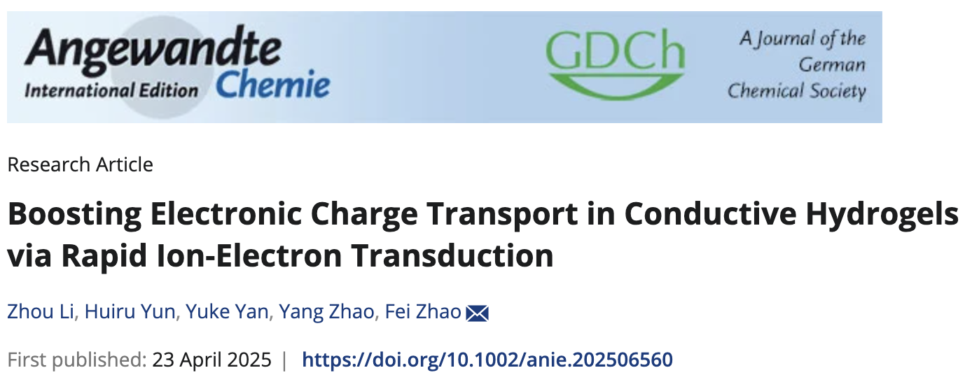 近日,亚洲无码 赵飞教授研究团队在国际顶级期刊《Angew. Chem., Int. Ed.》发表题目为“Boosting Electronic Charge Transport in Conductive Hydrogels via Rapid Ion-Electron Transduction”的研究论文(DOI:10.1002/anie.202506560),论文通讯单位为亚洲无码 ,第一作者为亚洲无码 的博士生李洲。