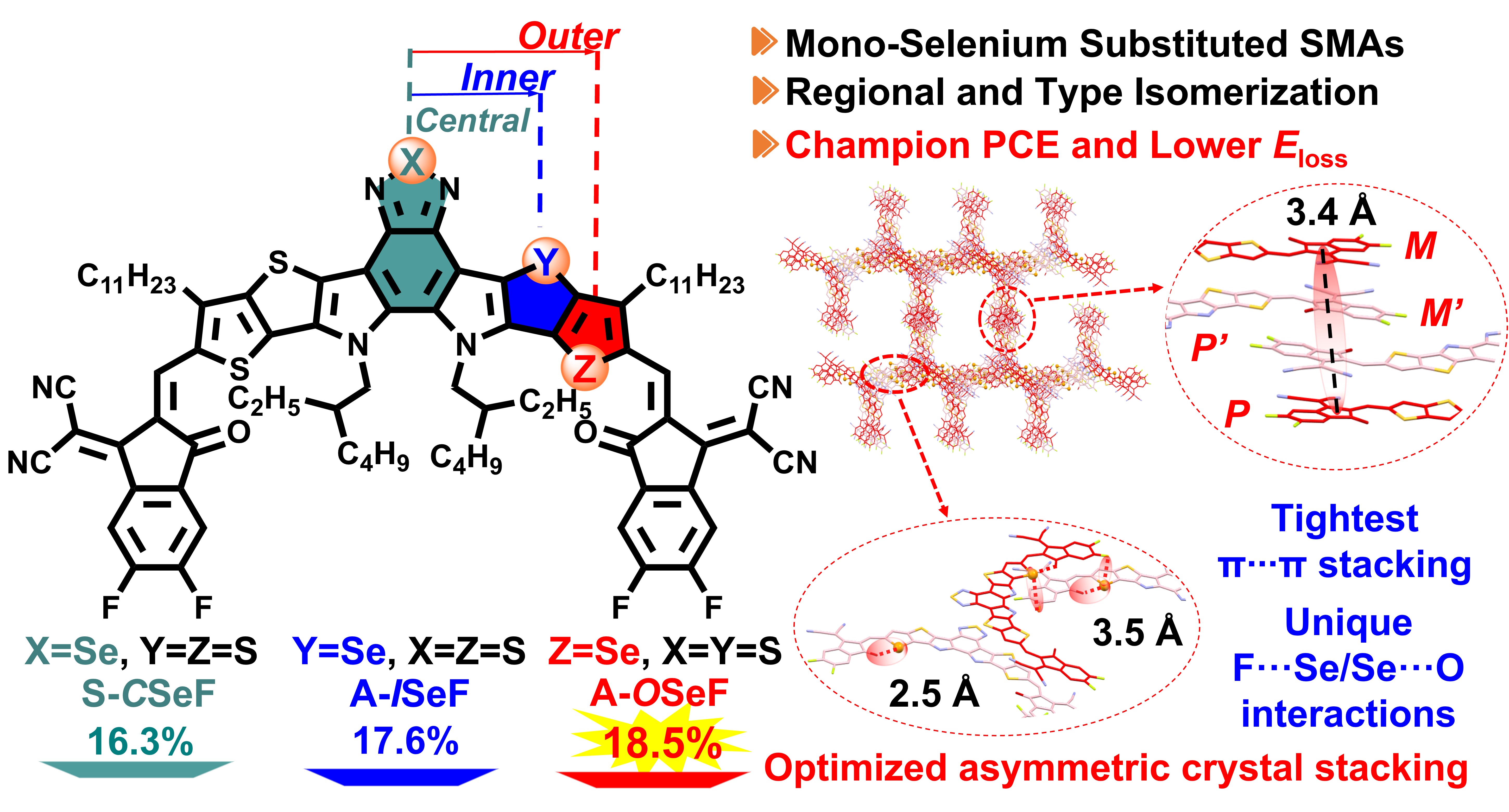 图1. 三个硒取代异构受体的分子结构、晶体堆积、器件效率及其设计策略