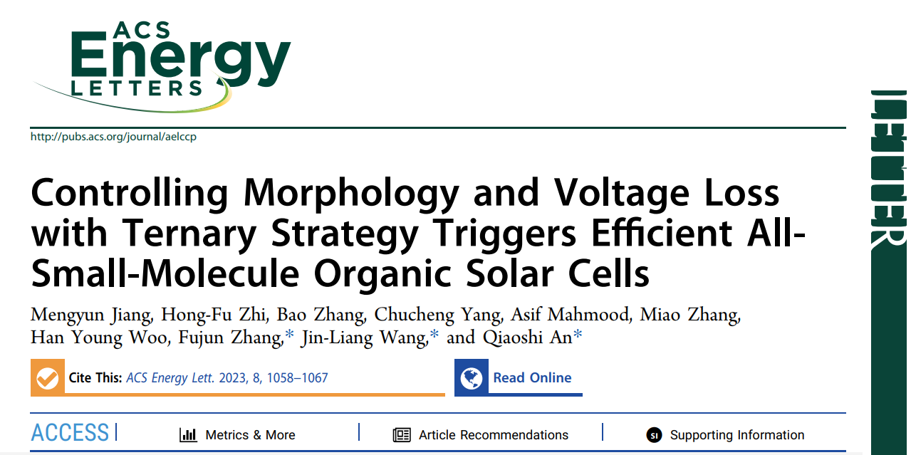 王金亮教授&安桥石特别研究员课题组在国际顶级期刊ACS Energy Letters(IF:23.9)发表题目为“Controlling Morphology and Voltage Loss with Ternary Strategy Triggers Efficient All-Small-Molecule Organic Solar Cells”的研究论文。亚洲无码