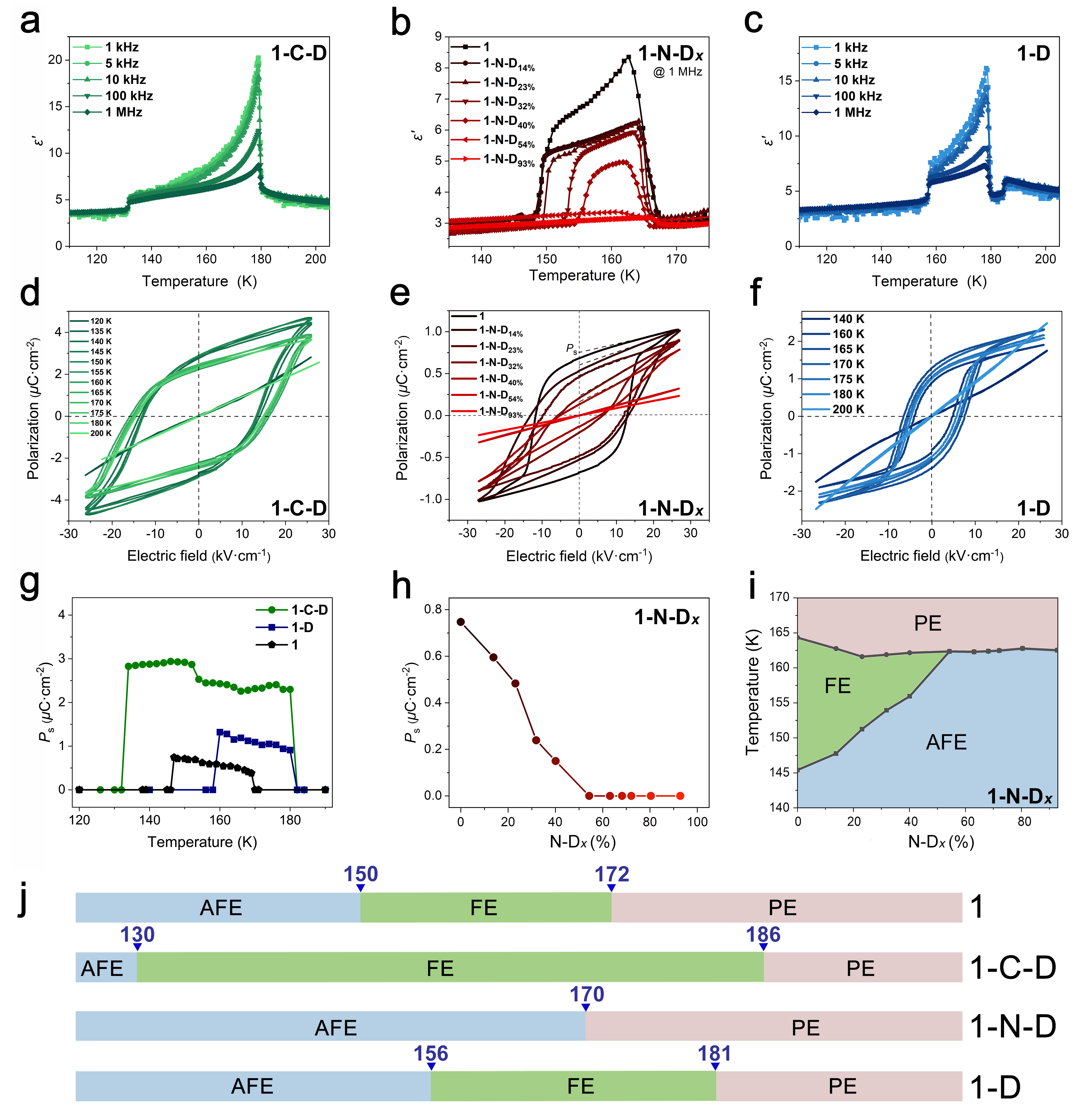 自1931年发现氘同位素以来,氘代被广泛用于调控材料的化学和物理性质。1942年,研究者发现氘代KH2PO4(KDP)后材料的铁电相变温度提高107 K,随后氘代被进一步研究应用于调控材料的导电、磁性、荧光性质等。在目前已知的研究体系中,显著的氘代效应发生在伴随质子转移的强氢键结构中,而对于更为普遍的弱氢键体系,氘代效应并不明显,这个问题极大的限制了氘代在物性调控方面的进一步应用。
