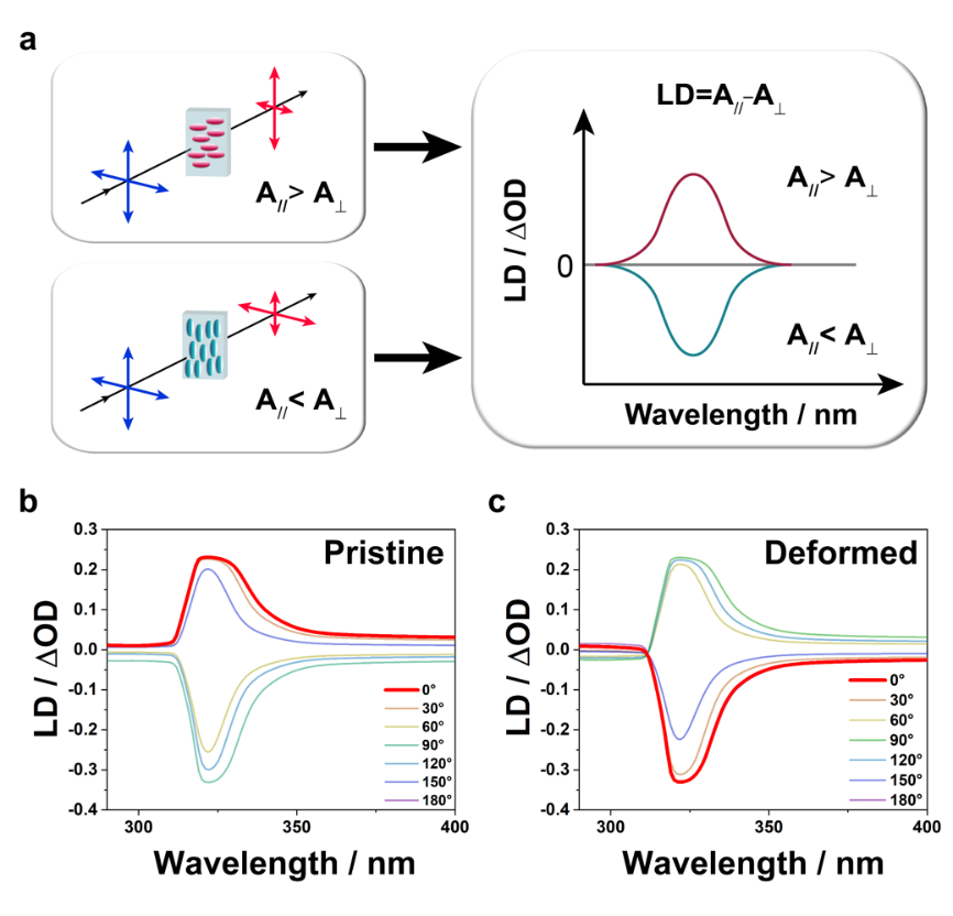 该研究基于压力作用下分子取向变化与超弹性质的结构关联出发,设计合成了新的晶态分子“陀螺”— (3,5-二甲基苯甲酸)-(4,4’-联吡啶)-(3,5-二甲基苯甲酸),利用4,4’-联吡啶在剪切力作用下绕氢键轴的90°旋转,实现了单晶的无扩散形变。当撤去外力时,变形晶体迅速恢复初始状态,表现出优异的超弹性能。这种可逆的应力变形具有良好的重复性,经数十次操作,单晶无明显破损。由于4,4’-联吡啶分子平面的90°转动改变了晶格内部跃迁矩的分布,材料线二色性信号在受力状态下发生可逆反转。