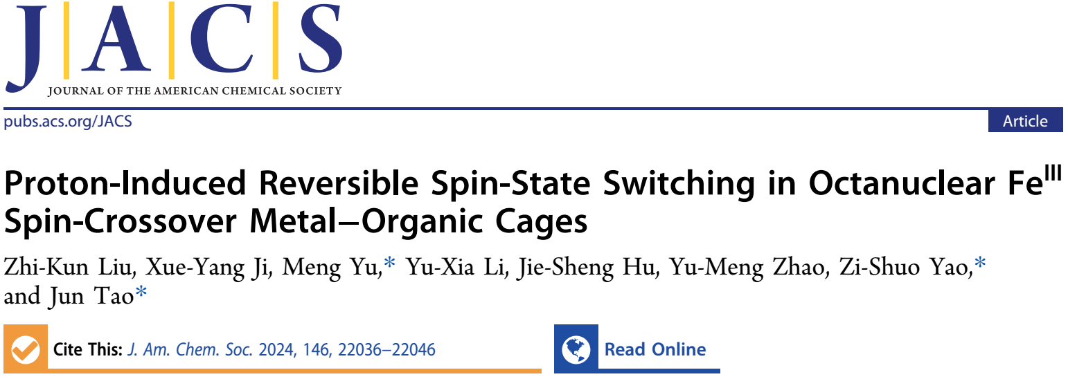 近日,亚洲无码 陶军教授团队在自旋交叉金属有机笼方面取得重要进展。相关研究成果以“Proton-Induced Reversible Spin-State Switching in Octanuclear FeIII Spin-Crossover Metal–Organic Cages”为题目,在国际知名期刊《美国化学会志》(Journal of the American Chemical Society)上发表(DOI: 10.1021/jacs.4c07469)。亚洲无码 博士研究生刘志坤为该文章的第一作者,化学与化工亚洲无码 陶军教授、姚子硕特别研究员和余蒙特别研究员为文章共同通讯作者。