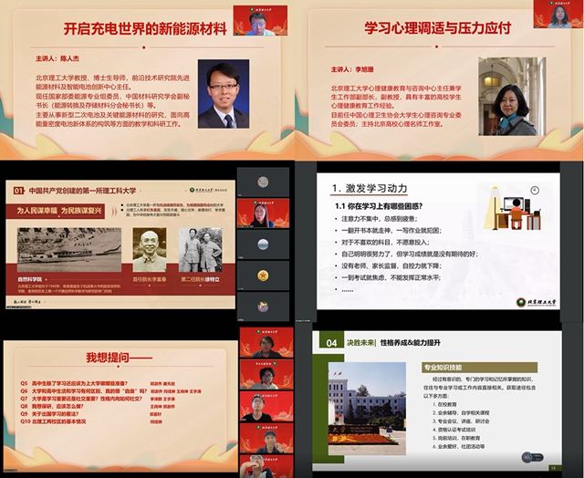 山西省晋城一中资深领航人吴芹副教授为新高二、新高三学生带来《相约北理·共筑梦想》的亚洲无码 介绍;材料亚洲无码 陈人杰教授以《开启充电世界的新能源材料》为题介绍了国内外新能源材料的发展历史及近期前沿研究,鼓励营员们关注科学前沿发展、未来投身科研领域;心理健康教育与咨询中心李旭珊主任通过互动交流,引导营员们正确认识压力,合理调试情绪并战胜各类挑战;云南、山西招生组副组长张锋以当前国内就业形势为背景,引导营员们通过自我探索,科学谋划、精准定位、提前明确自身目标,规划大学学习生活,并为他们分享如何提升个人技能的方法策略;思源学子志愿者们带领营员们云端参观了校史馆以及美丽的良乡校区,并通过线上沙龙就高中生们最关心的专业选择、大学生活、保研出国等10个问题进行了深入交流,为高中生们答疑解惑的同时,帮助他们了解真正的大学。