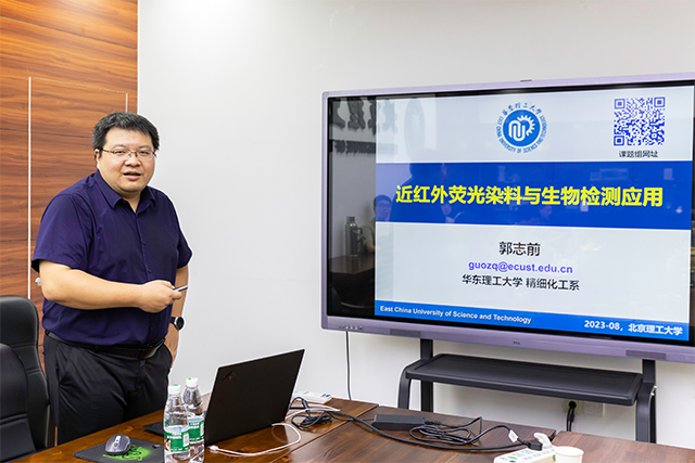 郭志前教授报告首先介绍了荧光染料在生物医学领域广阔的应用前景,特别是近红外荧光识别及荧光成像应用于组织或体内疾病的早期诊断和引导治疗。针对近红外染料母体种类少、既有染料光稳定性差等诸多制约限制,系统总结了课题组开发的喹啉腈等近红外染料母体,揭示了染料分子结构设计与荧光调控机制之间的规律;建立了具有普适性的高性能有机荧光染料纳米化制备方法,有力推动精细化工领域中高附加值的近红外功能染料应用转化。最后针对光谱响应、分子识别性能等,展示了近红外荧光染料在活体成像分析、体外诊断方面的基础应用研究。