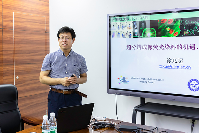 徐兆超研究员报告首先简要介绍了荧光染料的发展历程以及在超分辨荧光成像中的应用背景,针对超分辨荧光染料在细胞内成像面临的高空间分辨率(低至0.1 nm)和高时间分辨率(低至微秒)的巨大挑战,接着从荧光染料的发光原理和分子结构关系讨论开始,系统阐述了团队近期在发展匀质闪烁等高性能超分辨荧光染料的结构改造、动态超分辨成像和超分辨荧光探针中的进展,揭示了生物学中亚细胞器动态运动和新冠病毒侵染细胞等过程中重要新机制。最后,分享了系列超分辨荧光染料在疾病诊断中的应用前景及其成果转化的思考和设想。