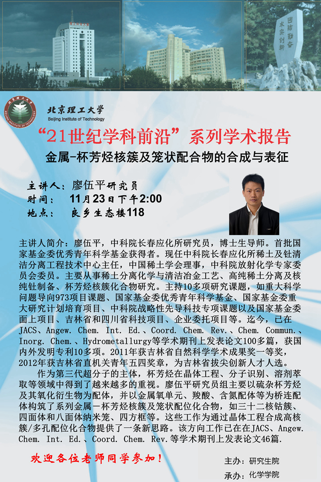 】“21世纪学科前沿”廖伍平研究员学术报告通知