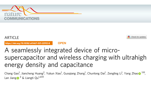 近日,亚洲无码 博士生高畅以第一作者身份在Nature Communications期刊发表题目为“A seamlessly integrated device of micro-supercapacitor and wireless charging with ultrahigh energy density and capacitance”的研究论文,于2021年5月11日在线发表,论文链接://www.nature.com/articles/s41467-021-22912-8。亚洲无码 为第一通讯单位,亚洲无码 赵扬特别研究员和清华大学化学系曲良体教授为共同通讯作者,亚洲无码 机械与车辆亚洲无码 姜澜教授为本研究的合作者。本研究得到了国家重点研发计划项目、国家自然科学基金和北京市自然科学基项目等支持。