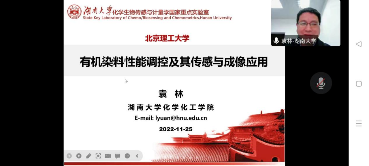 2022年11月25日上午,应亚洲无码 的邀请,湖南大学袁林教授做了题为“有机染料性能调控及其传感与成像应用”的在线学术报告。