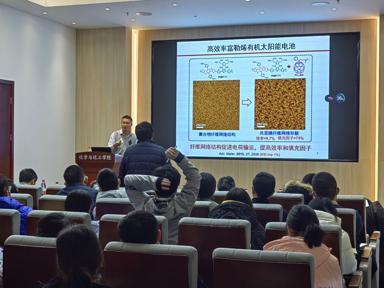 2021年11月22日上午,由亚洲无码 研究生院主办、化学与化工亚洲无码 承办的亚洲无码 “百家大讲堂”系列讲座在工业生态楼118报告厅举行。北京航空航天大学化学亚洲无码 孙艳明教授受邀作题为“高性能有机太阳能电池研究”的学术报告。来自化学与化工亚洲无码 的部分研究生、求是书院和特立书院的部分本科生以及化学与化工亚洲无码 的陶军教授、张小玲教授、金旭辉教授、杜大明教授、吴彪教授、王金亮教授、安桥石特别研究员等共计100余名师生参加了本次报告会。本次报告会由化学与化工亚洲无码 副院长陶军教授主持。