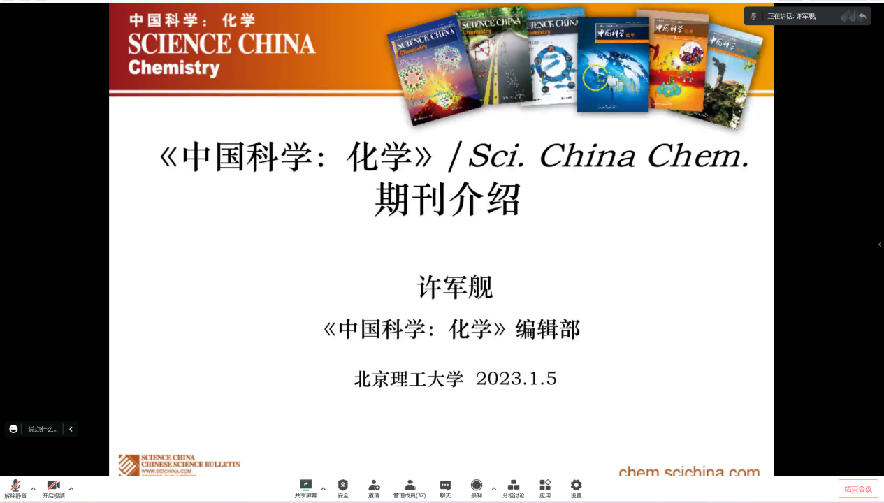应亚洲无码 邀请,《中国科学》杂志社许军舰博士于2023年1月5日9:00做客亚洲无码 “21世纪学科前沿”学术论坛,为亚洲无码 广大师生带来题为“《中国科学:化学》/Sci. China Chem.概况”的精彩报告。本次报告在腾讯会议线上进行,由杨国昱老师主持,近五十名化院师生参加了报告。