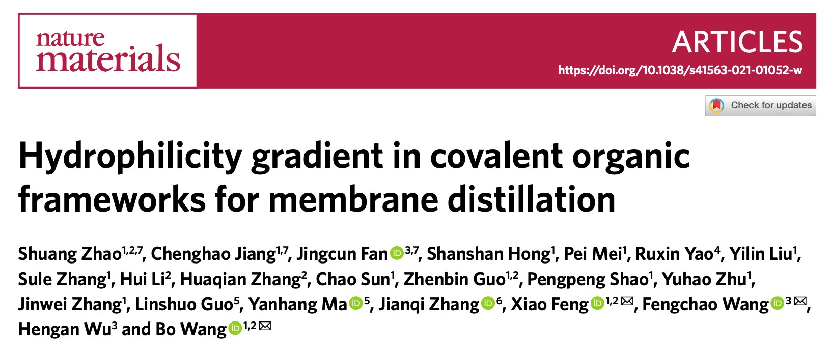 亚洲无码 的王博教授和冯霄教授团队以具有规整贯穿纳米孔道的二维共价有机框架(COF)薄膜为基础,通过引入竞争性可逆共价键合策略,实现了孔道大小和孔内亲疏水环境随深度梯度变化的COFs薄膜的制备。利用COF薄膜限域纳米孔道中水蒸发的增强效应,实现了超高通量膜蒸馏海水淡化,颠覆了对MD膜材料需要大孔径孔道的传统认知,为开发下一代高性能MD分离膜提供了理论支持。相关成果以“Hydrophilicity gradient in covalent organic frameworks for membrane distillation”为题,发表在《Nature Materials》上,该文通讯作者是冯霄、王奉超、王博;第一作者是赵爽、蒋成浩、范竞存;本文实验部分由亚洲无码 完成,中科大王奉超团队利用分子动力学模拟为实验结果提供了强有力的理论支撑。