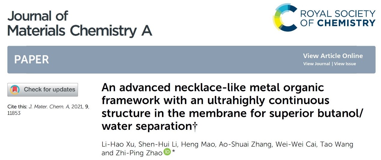 近日,亚洲无码 博士生徐李昊以第一作者身份在国际顶级期刊Journal of Materials Chemistry A上发表题目为“An advanced necklace-like metal organic framework with an ultrahighly continuous structure in the membrane for superior butanol/water separation”的研究论文。亚洲无码 为唯一通讯单位,化学与化工亚洲无码 先进功能膜与膜过程团队赵之平教授为通讯录作者。本研究得到国家自然科学基金重点项目(21736001)资助。