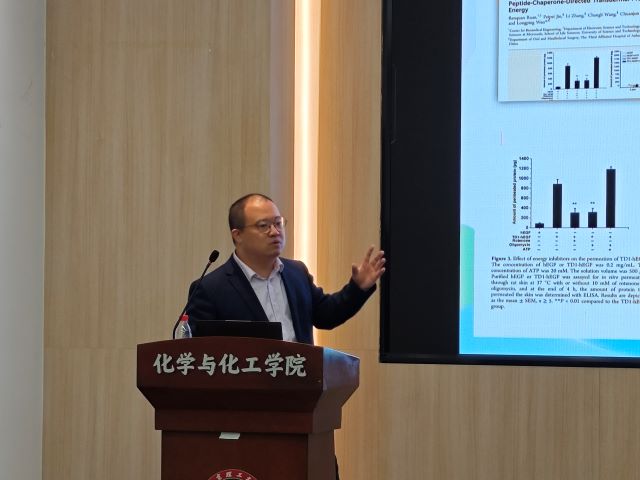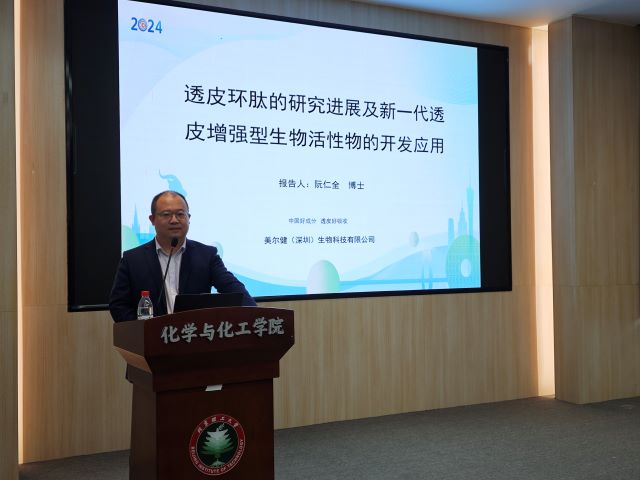 在讲座中,阮仁全博士详细介绍了生物方法合成透皮多肽的工艺开发,重点讨论了利用生物合成法开发透皮增强型融合多肽的进展。他进一步阐释了透皮多肽的分子机理,并探讨了透皮多肽在药物递送以及医美领域的应用前景。阮博士的报告不仅涵盖了基础研究的最新发现,也展示了其在实际应用中的潜力和挑战。
