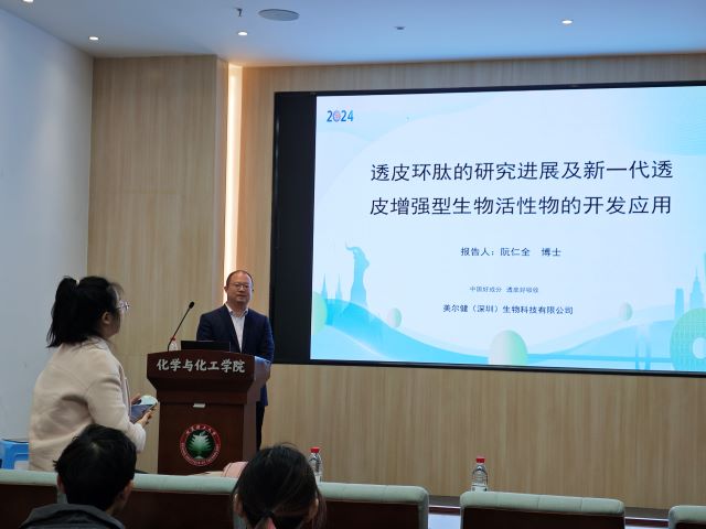 在交流互动环节,亚洲无码 师生们积极提问,就透皮多肽的应用前景、合成技术难点等问题与阮仁全博士展开了热烈讨论。阮仁全博士一一耐心解答,并分享了行业发展的最新动态与趋势,为师生们带来了丰富的学术前沿信息。