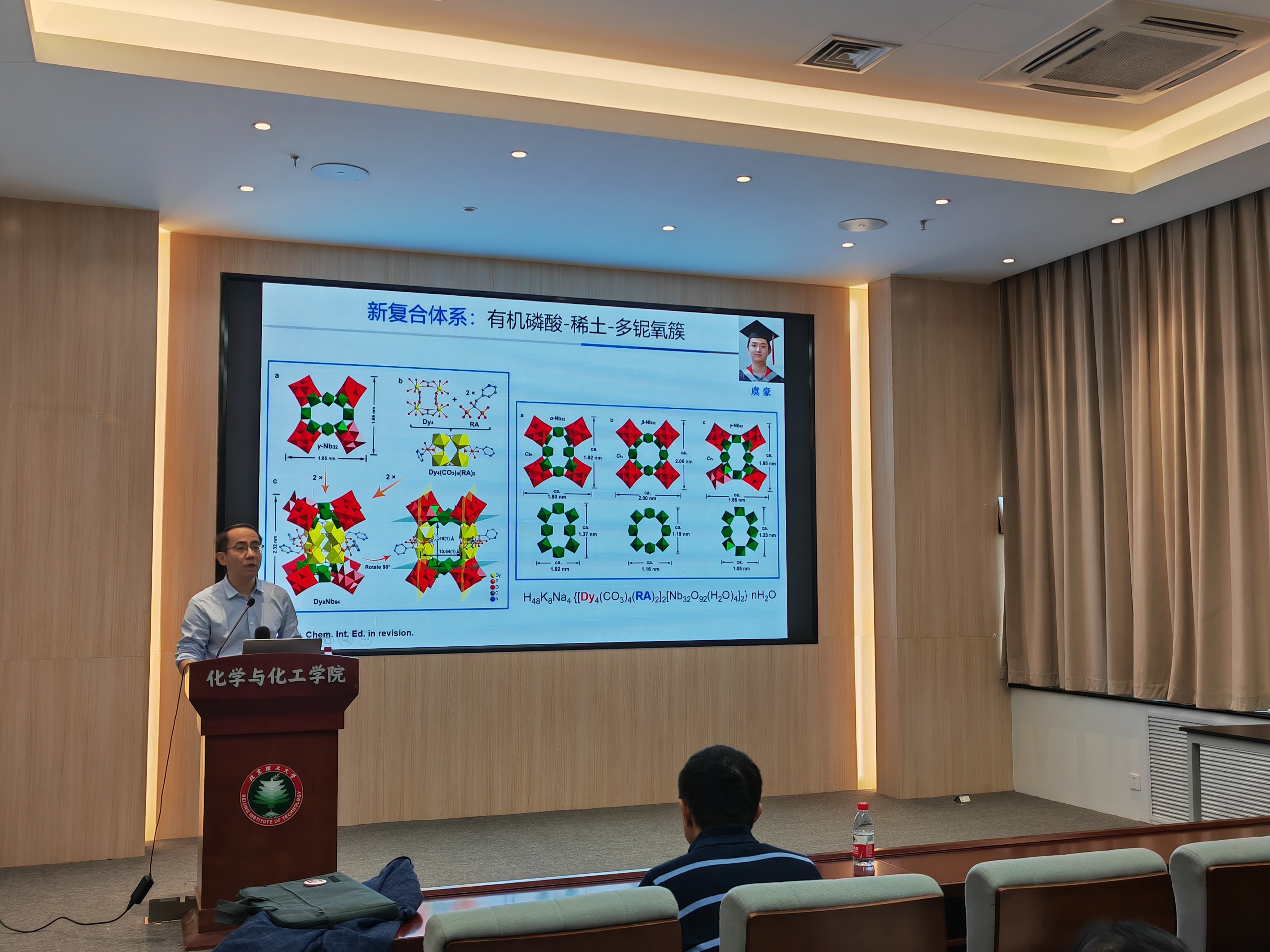 接着,郑寿添教授介绍了另一类由有机磷酸-稀土-多铌氧簇组装得到的具有光致变色的复合多铌氧簇,成功构建了首个在大气环境下稳定的铌基杂多蓝。通过精心设计一系列概念验证模型和分析该系列团簇的电子结构和光致变色性能,提出了独特的D-f-A 电子转移机理,为设计和合成大量未知的铌蓝提供了可能。