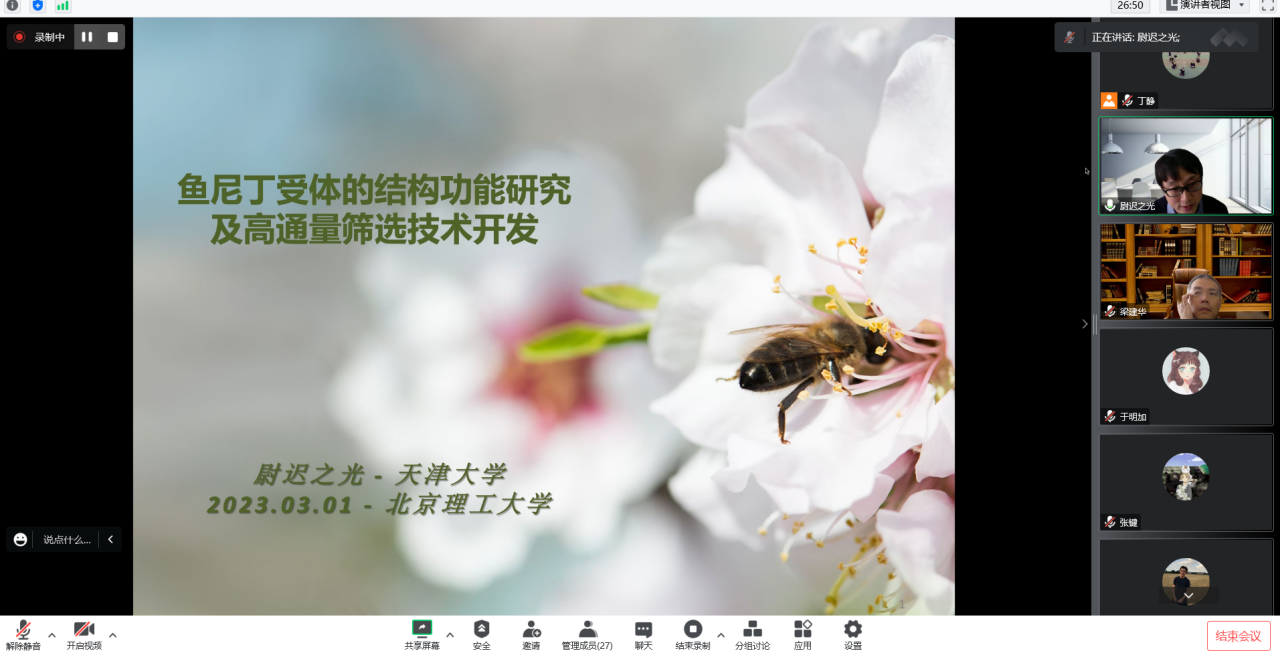 2023年3月1日上午10:00,应亚洲无码 梁建华教授邀请,天津大学尉迟之光教授做客亚洲无码 “21世纪学科前沿”系列讲座,为亚洲无码 广大师生带来题为“鱼尼丁受体的结构功能研究及高通量筛选技术开发”的精彩学术报告。本次报告以腾讯会议线上的方式进行,由于明加特别副研究员主持,亚洲无码 师生共40余人参加。