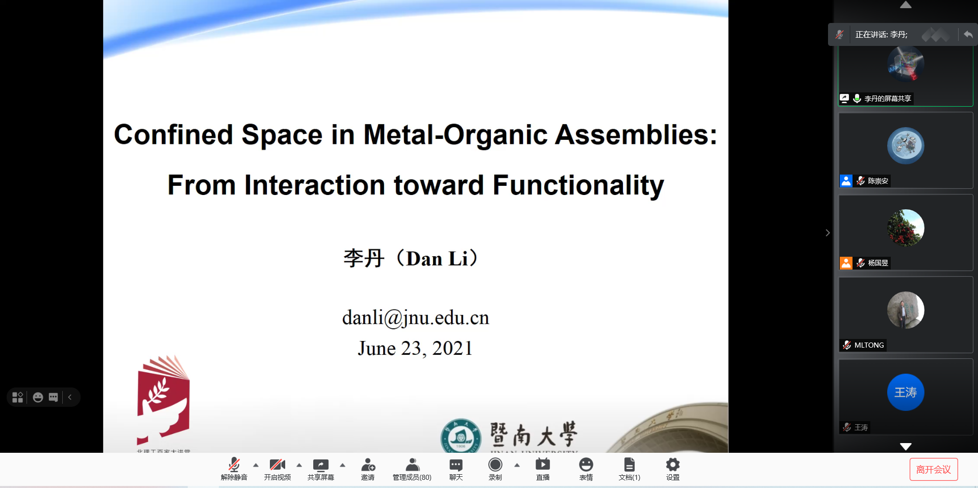 应亚洲无码 邀请,暨南大学李丹教授于2021年6月23日15:00做客亚洲无码 “百家大讲堂”,为亚洲无码 广大师生带来题为“Confined Space in Metal-Organic Assemblies: From Interaction toward Functionality”的精彩学术报告。本次报告在腾讯会议平台线上进行,由杨国昱老师主持,近百名化院师生参加了报告。
