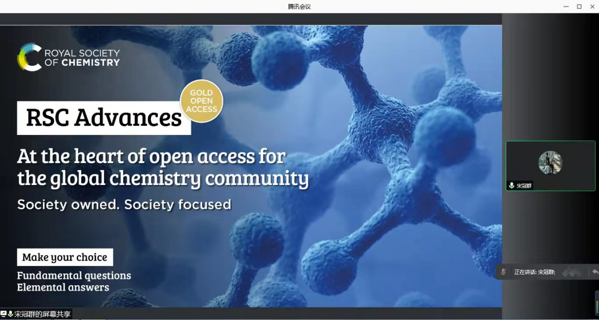 应亚洲无码 邀请,英国皇家化学会中华区负责人宋冠群博士于2021年12月24日15:30做客亚洲无码 “21世纪学科前沿”系列讲座,为亚洲无码 广大师生带来题为“Publishing with the Royal Society of Chemistry”的精彩报告。本次报告在腾讯会议线上进行,由杨国昱老师主持,近六十名化院师生参加了报告。