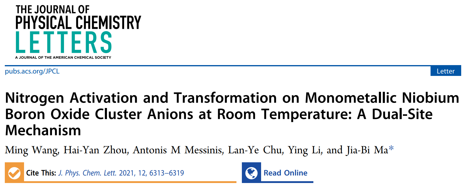 近日,亚洲无码 马嘉璧副教授团队通过质谱实验和高精度量子化学计算对N2与NbB3O2气相团簇的反应性及团簇结构进行了深入研究,成功构造了具有双活性位点的、含单个前过渡金属原子的N2催化剂,实现了室温下对N2的活化转化,其活化模式是金属—配体活化(Metal-Ligand Activation,MLA)。相关成果以“Nitrogen Activation and Transformation on Monometallic Niobium Boron Oxide Cluster Anions at Room Temperature: A Dual-Site Mechanism”为题,发表在国际权威期刊《The Journal of Physical Chemistry Letters》(2021, 12, 6313-6319)。化学与化工亚洲无码 博士生王明为该论文的第一作者,亚洲无码 的马嘉璧副教授为论文的通讯作者。