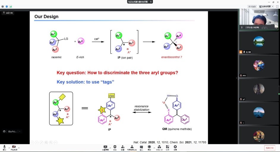 孙建伟教授从不对称有机催化的发展背景出发,系统介绍了手性Brønsted酸催化含氧、氮四元杂环的不对称开环,对醌、邻醌甲基化物的选择性加成,四芳基甲烷的不对称合成,吲哚去芳构化亚胺甲基化物的不对称反应,以及复杂手性螺环磷酸骨架的设计合成与应用最新研究进展。孙建伟教授从如何设计以及如何发展解决这些不对称催化反应远程控制的新策略,都做了细致深入的讲解。这次学术报告的信息量很大,学习价值极高。