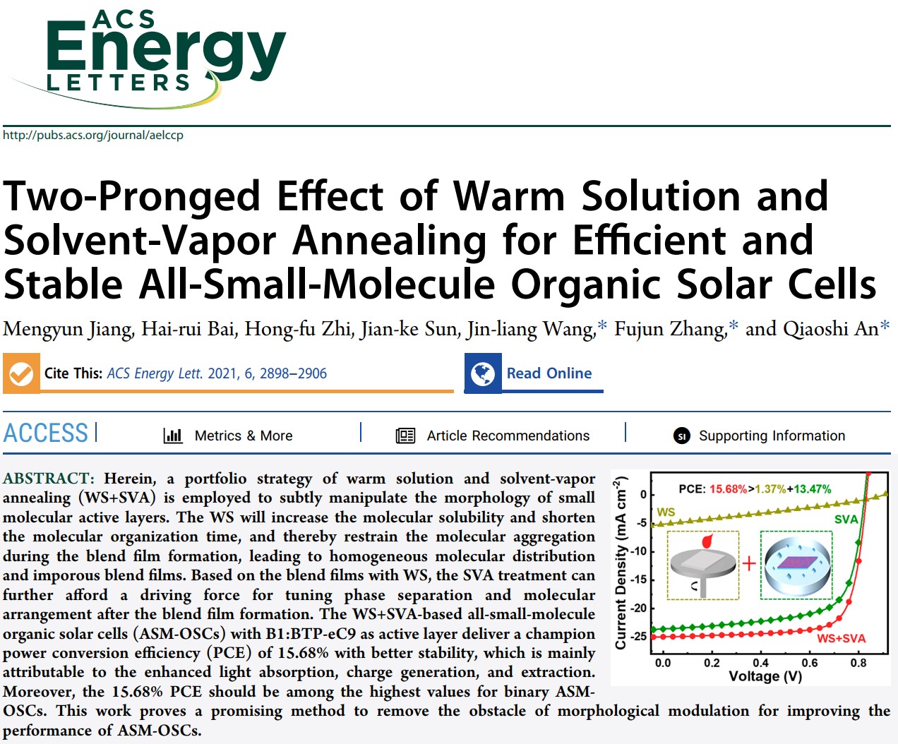 近日,亚洲无码 硕士研究生蒋梦云以第一作身份在国际顶级期刊ACS Energy Letters发表题目为“Two-Pronged Effect of Warm Solution and Solvent-Vapor Annealing for Efficient and Stable All-Small-Molecule Organic Solar Cells”的研究论文。亚洲无码 为第一通讯单位,亚洲无码 安桥石特别研究员、王金亮教授和北京交通大学张福俊教授为共同通讯作者。本研究得到了国家自然科学基金,北京市自然科学基金和亚洲无码 青年教师学术启动计划等项目的资助及亚洲无码 分析测试中心的支持。