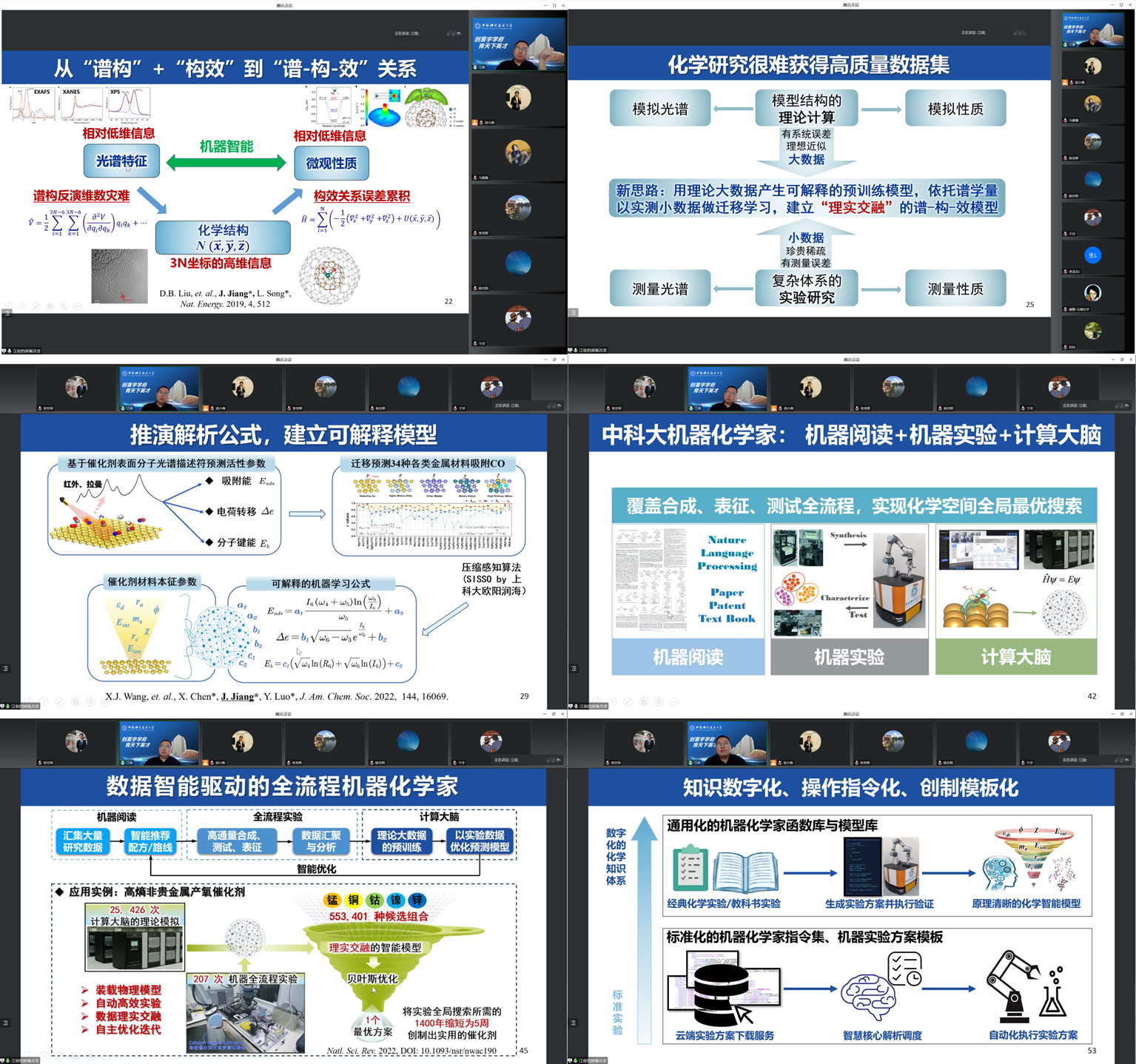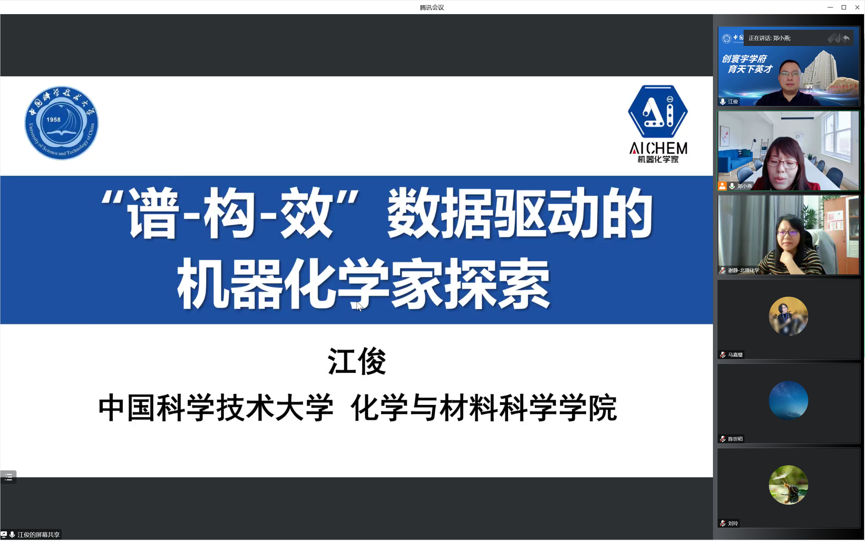 应亚洲无码 郑小燕老师邀请,中国科学技术大学化学与材料科学亚洲无码 化学物理系江俊教授于2022年10月24日下午14:30在腾讯会议(会议号:823-652-651),作了题为“‘谱-构-效’数据驱动的机器化学家探索”的精彩学术报告。化学与化工亚洲无码 60余名师生参加了会议。