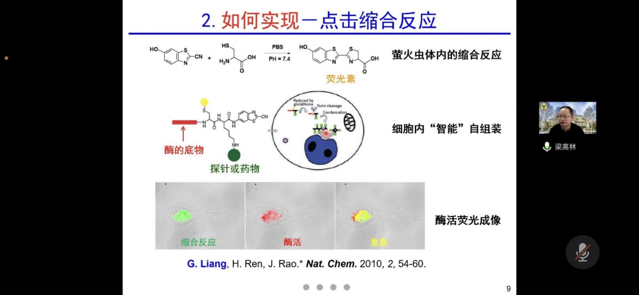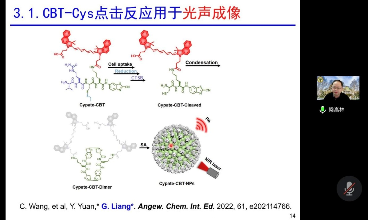 梁高林教授首先介绍了利用化学手段在分子与细胞层面对生物过程的分子影像的成像分析,并指出在分子影像所包含的6个步骤中,信号放大策略是分子影像的关键科学问题之一。随后,梁高林教授详细讲述了点击反应与分子影像结合的反应过程和点击反应放大成像信号的特点及研究方法。
